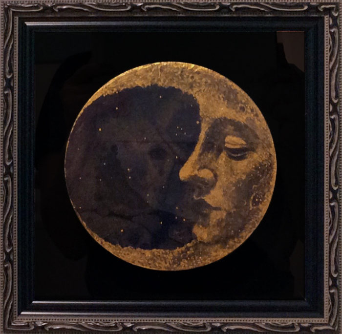 作品タイトル:Luna crescente 三日月 (円形左向き) 作家名:髙木紀子 サイズ:φ15cm メディア等:Canvas、Marbring、AQYLA、Gold leaf その他:2021年制作