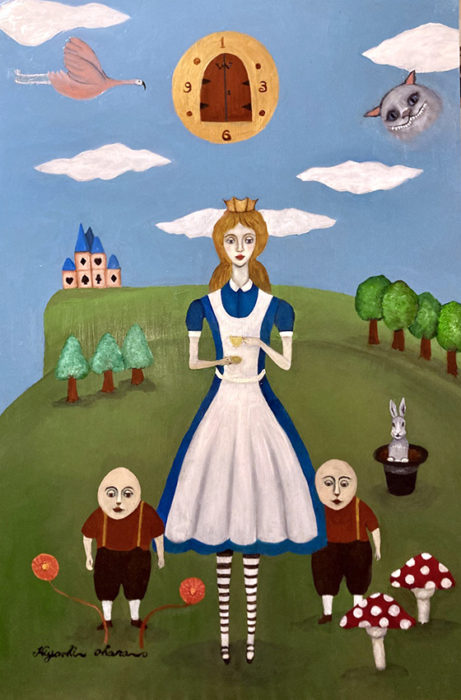 作品タイトル:不思議の国の丘の上で(オマージュ・アリス) 作家名:小原聖史 サイズ: M30号 メディア等: パネル、油彩 その他:仮額付き(サービス)※画像2枚目をご参照ください。