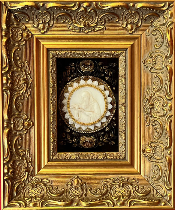 作品タイトル:No.T15_聖コンラード 作家名:宮前あけみ サイズ:額込み約H24.2×W18.7×D8.7cm メディア等;ブリヨン(純金メッキワイヤー)、純金メッキ平ワイヤー、蜜蝋、スワロフスキー、他