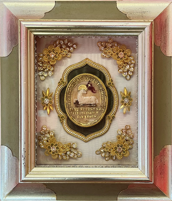 作品タイトル:No.L7_Sanctus Agnus 作家名:宮前あけみ サイズ:額込み約H30.5×W26.5×D5.5cm メディア等;ブリヨン、スワロフスキー、樹脂パール、蜜蝋、ペリドット、他