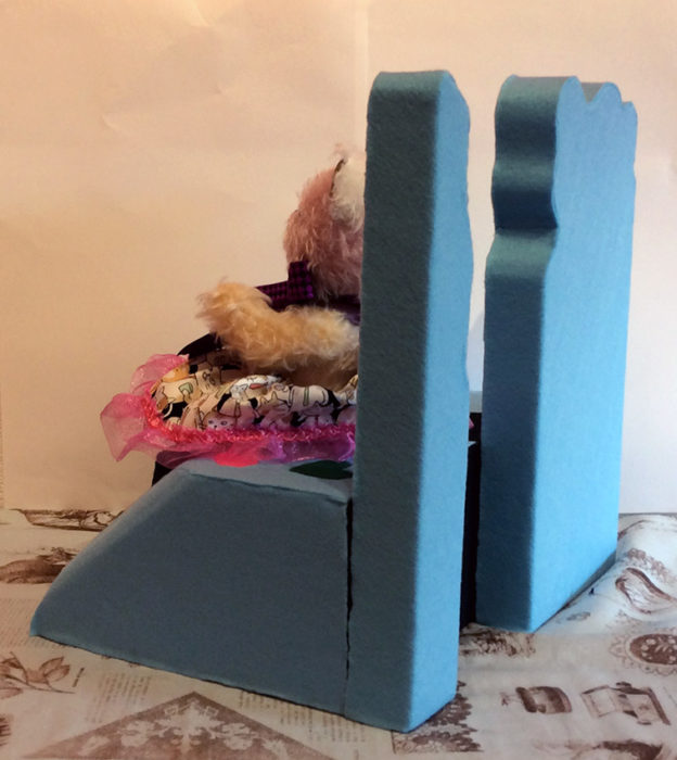 作品タイトル:これからデート♡(彼氏待ち…) 作家名:ちぷりた サイズ:縦29×横29×高さ30cm メディア等:テディベア_モヘア、ジョイント、わた、ガラスアイ、リボン 背景_木目込 フェルト、土台
