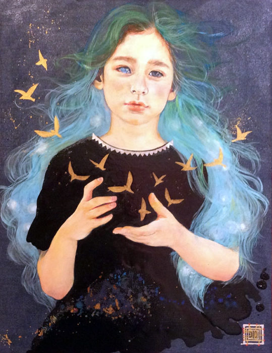 作品タイトル:Fluctuation Ⅳ 作家名:金茂華 サイズ:F6 (41cm × 31.8cm) メディア等:Gouache,Japanese lacquer,pearl work(shell),gold powder