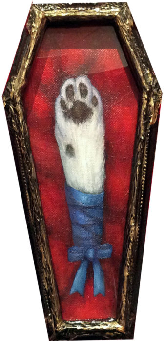 作品タイトル:ほしいものリスト *にくきゅうてって* 作家名:福本綾 サイズ:額装9×19cm メディア等:作品本体_キャンバス、油彩 額_アクリル彩色後ニス塗装、ミクストメディア
