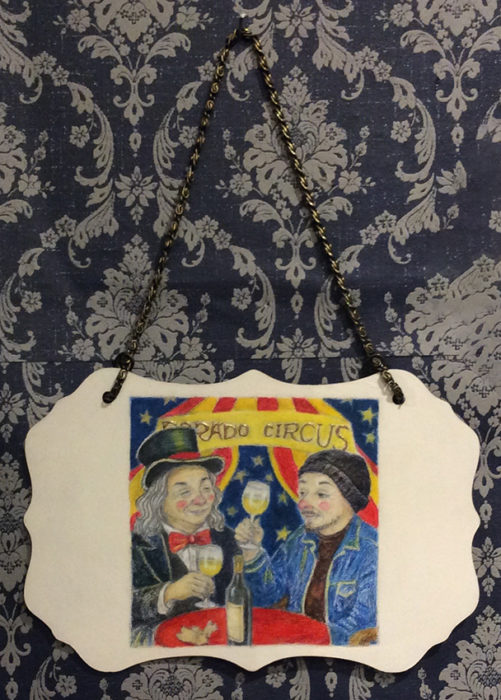 作品タイトル:Cheers!閉幕後の2人 作家名:Marie San サイズ:鎖含めず14.5×22cm メディア等:アクリル絵の具、色鉛筆、レジン、ミラーパウダー、グラフィックペン