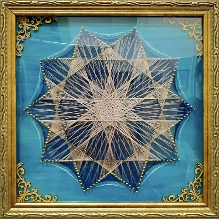 メディア等:板、真鍮釘、糸、アクリル絵具など